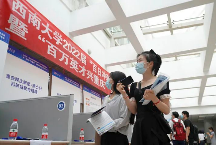 圖片▲在位于重慶市北碚區的西南大學,應屆畢業生參加“百萬英才興重慶”招聘會(2022年5月13日攝)。用人單位提供了涉及教育、人工智能、汽車制造等領域的3000多個崗位供畢業生選擇。新華社發(秦廷富 攝)