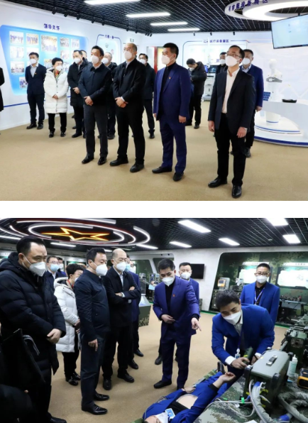 譚作鈞一行參觀了中國船舶集團旗下中船海神醫療科技有限公司應急醫療救援裝備展廳,觀摩了公司自主研制的便攜式通用生命支持系統模擬急救現場演示,詳細了解了有關產品的技術研發、性能指標、應用場景和生產保供能力等情況。