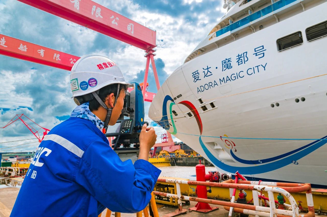精度技術(shù)部的員工正在監(jiān)測國產(chǎn)首艘大型郵輪試航歸來時的精準(zhǔn)坐墩數(shù)據(jù)。
