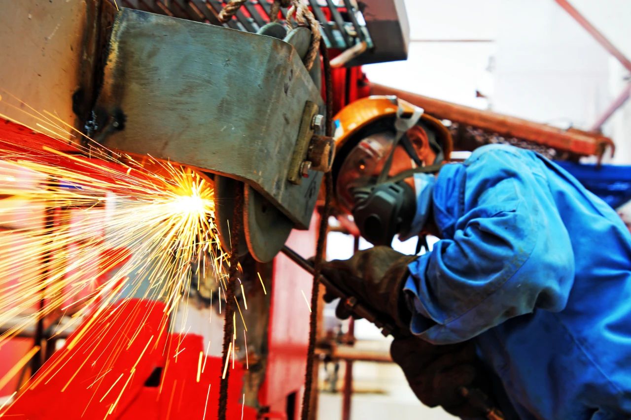 電焊工,就文沖修造最美的一線工人,他們從頭到腳“全副武裝”,一副墨鏡,一個面罩,一套包裹的嚴(yán)嚴(yán)實實的工作服是他們的色調(diào)。此起彼伏吱吱作響的燒焊聲,黃紅藍色的焊花,伴著刺眼的弧光,如噴泉一般是他們奏響的樂章。