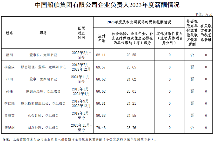 中國船舶集團(tuán)有限公司企業(yè)負(fù)責(zé)人2023年度薪酬情況